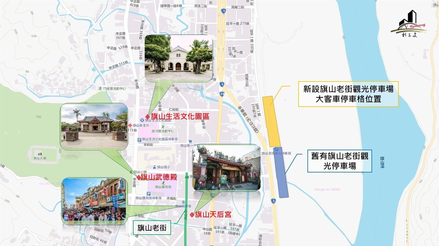 新工處則補充,新設進場通道總長度約255公尺路寬8公尺,停車空間長240公尺、寬約46公尺,新增100格小客車位與50格大客車位,新停車場開放後將提升當地經濟及交通順暢度。市府在旗山地區積極推動各項工程建設,不僅提昇當地生活品質及交通便利,讓旗山成為更適合旅遊與居住的好地方。